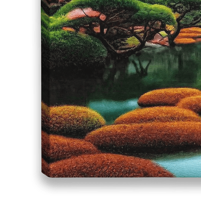 De schoonheid van een Japanse tuin wordt in dit werk bijzonder benadrukt door het gebruik van sterke kleuraccenten.