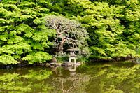 Japanse tuin, water en groen, zen tuin, spiegeling, Shinjuku Gyoen park, Tokio, Tokyo park,