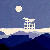 Een modern kunstwerk in blauwe kleuren en andere aangename kleuren. Een minimalistisch Japans landschap met bergen, maan en torii.