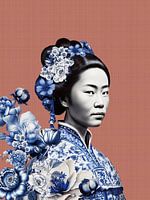 Een echte eyecather, een portret van een Japanse vrouw, in Geisha stijl. Dit werk vol bloemen is uitgevoerd in een delfts blauwe kleurstelling. Traditioneel, Aziatisch en krachtig. Dit portret heeft een terra, roze achtergrond en maakt het contrast met het Blauw groot en gedurfd. En zal prachtig staan in een modern, luxe of strak interieur.