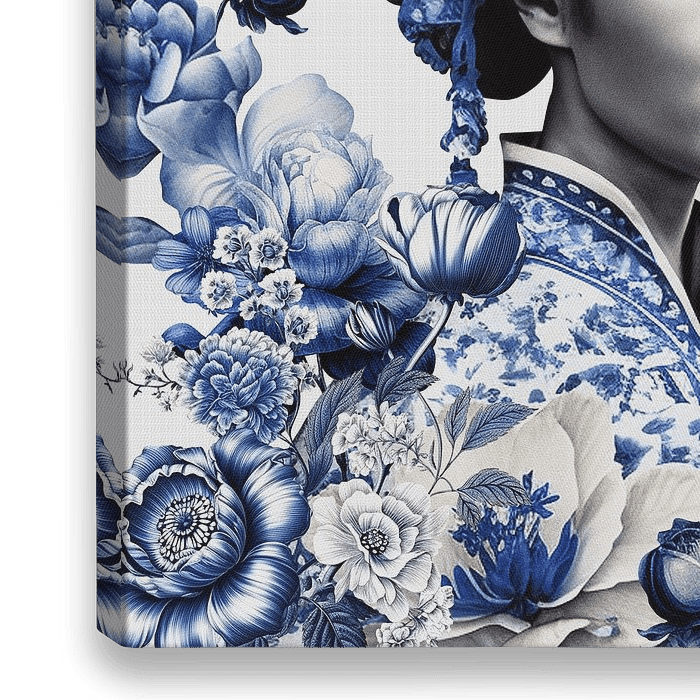 Koop dit bloemen kunstwerk Japanse vrouw in Delfts blauw op Witte achtergrond, moderne variatie op een Geisha portret van Mijke Konijn als print op canvas, aluminium dibond, (ingelijste) fotoprint, behang en ArtFrame. Voor jou op maat geprint in Fine-Art kwaliteit.