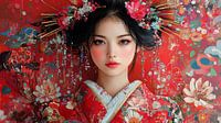 Op de afbeelding staat een jonge vrouw met lang zwart haar die een traditionele Japanse kimono draagt. De kimono heeft een levendige rode kleur met ingewikkelde bloemmotieven en gouden accenten. Ze is versierd met rode bloemen in haar haar en haar make-up is gedurfd en opvallend, met rode lippen en bruine oogschaduw. De achtergrond is…