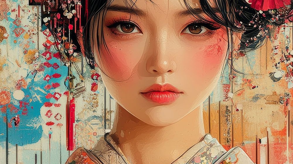 Op de afbeelding staat een jonge vrouw met lang zwart haar die een traditionele Japanse kimono draagt. De kimono heeft een levendige rode kleur met ingewikkelde bloemmotieven en gouden accenten. Ze is versierd met rode bloemen in haar haar en haar make-up is gedurfd en opvallend, met rode lippen en bruine oogschaduw. De achtergrond is een waas van rood, wit en goud, wat een gevoel van beweging en energie creëert.