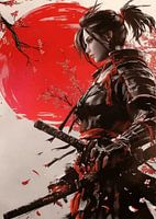 In dit fascinerende kunstwerk draagt een felle Japanse vrouwelijke samoerai een ingewikkeld, volledig harnas, dat kracht en gratie belichaamt. Ze houdt haar glanzende katana vast en staat te midden van een wirwar van delicate rode kersenbloesems die dansen in de wind. De stralende rode zon werpt een warme gloed die de traditionele Japanse esthetiek van dit opvallende schilderij versterkt.