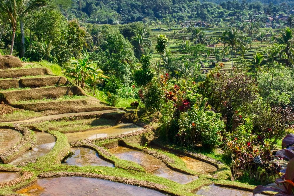 Betreed de betoverende wereld van de Jatiluwih Rijstterrassen, een UNESCO-werelderfgoed, met deze levendige foto. De rijstterrassen strekken zich uit over de glooiende heuvels en bieden een prachtig uitzicht op de landbouwkunst van Bali. Voorin de foto contrasteren felrode bladeren prachtig met de weelderige groene terrassen, wat de scène een extra dimensie van kleur en schoonheid geeft. Op de achtergrond torent de majestueuze Mount Batukaru, die de rust en grandeur van het landschap benadrukt.