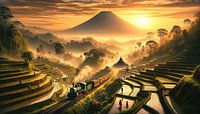 de etherische schoonheid van zonsopgang in Java, Indonesië. De eerste zonnestralen vallen over een landschap dat wordt gekenmerkt door rijstvelden in terrasbouw en traditionele architectuur, met de majestueuze berg Merapi op de achtergrond, sereen en krachtig. De Borobudur Tempel steekt af tegen het ochtendlicht en voegt een mystieke…