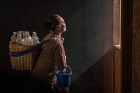 Een Javaanse oudere vrouw die glazen flessen met traditionele kruiden drankjes op haar rug draagt om van huis tot huis te verkopen. Portret van haar voor het raam in een wat donkere kamer.