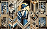 Een elegant Art Deco tafereel waar structuur de sfeer bepaalt. Een gestileerde figuur verankert het middelpunt terwijl geometrische randen, getrapte vormen en subtiele waaiermotieven de blik leiden. Diep houtskool en zwart vormen het decor voor afgemeten accenten in goud en ivoor, zodat de gloed beheerst aanvoelt in plaats van opzichtig. Van dichtbij volgen fijne contourlijnen de revers en plooien, smalle banden echoën lobbypanelen en een rustige negatieve ruimte houdt de scène rustig.