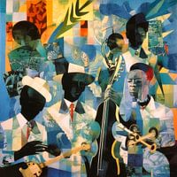 Kleurrijk abstract motief van muzikanten in de stijl van een schilderij.