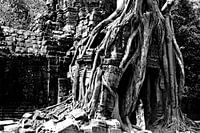 Verloren in de immensiteit van Angkor onthult de tempel van Ta Som een fascinerend schouwspel waar natuur en architectuur één worden. In zwart-wit onthult het beeld alle majesteit van dit oude bouwwerk, uitgehouwen in steen en langzaam veroverd door de uitgestrekte wortels van de kaasbomen. Het contrast tussen de ruwe textuur van de verweerde stenen en de zachtheid van de kronkelende wortels onderstreept de rauwe schoonheid van deze mystieke plek. De toegangsdeur, bijna volledig opgeslokt door de boom, lijkt een doorgang naar een vervlogen tijdperk, een stille getuigenis van het Khmer-verleden. In dit in monochroom bevroren tafereel vertelt elke barst, elk reliëf in de rots en elke verstrengeling van vegetatie het verhaal van een duizend jaar oude strijd tussen mens en natuur. Ta Som, hoewel bescheidener dan andere Angkor tempels, is niettemin een meesterwerk waar de tijd stilstaat.