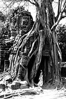 Verloren in de immensiteit van Angkor onthult de tempel van Ta Som een fascinerend schouwspel waar natuur en architectuur één worden. In zwart-wit onthult het beeld alle majesteit van dit oude bouwwerk, uitgehouwen in steen en langzaam veroverd door de uitgestrekte wortels van de kaasbomen. Het contrast tussen de ruwe textuur van de…
