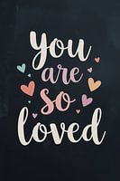 Digitale afbeelding met de tekst "You are so loved" met kleurrijke hartjes tegen een donkere achtergrond met structuur.