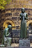 Groepssculptuur van de troostende Christus door Selmar Werner bij de fontein op de binnenplaats van de Versöhnungskirche te Dresden, Saksen, Duitsland.