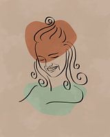 Minimalistisch portret van een lachende vrouw met lang krullend haar.