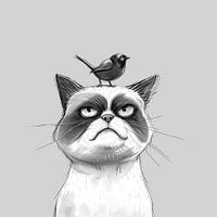 Een boze kat zit met een klein vogeltje op zijn hoofd. De gezichtsuitdrukking van de kat contrasteert op humoristische wijze met de kalme houding van de vogel.