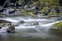 Een foto waar de dynamiek van het water van af spat. De beweging en stroming is bijna voelbaar als je naar deze plaat kijkt. Het water tussen alle rotsen en stenen door.