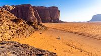 Kleine jeep in het oranje landschap van Wadi Rum in Jordanië.