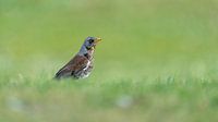 Een jeneverbeslijster, dicht bij de grond en op ooghoogte gefotografeerd.