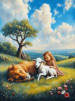 Koop dit leeuwen kunstwerk Jesaja 11:6-8 Een visioen van het paradijs leeuw lam en kind van Jolique Arte als print op canvas, aluminium dibond, (ingelijste) fotoprint, behang en ArtFrame. Voor jou op maat geprint in Fine-Art kwaliteit.