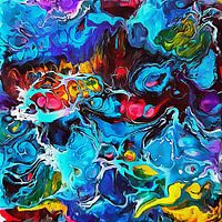 De oorspronkelijke acryldip voor dit beeld is gemaakt op een kleine, vierkante wandtegel ter grootte van een borrelplank. Ingescand en digitaal verbeterd, ontstond een prachtig borrelend veelkleurig beeld vol beweging, dat ik Jet Propulsion heb genoemd. Ik hou van de combinaties van blauwe en paarse tinten met de contrasterende warmere kleuren rood en geel.