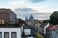 Jette, Brussels Capital Region -Belgium - 11 05 2020 Cityscape view over a residential street with apartments and the Basilica of the sacred heart during a colorful sunset