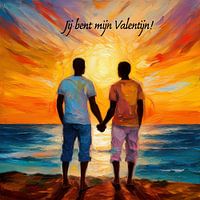 Twee mannen hand in hand aan zee bij zonsondergang met de tekst "Jij bent mijn Valentijn"