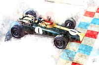 Illustratie van een serie legendarische Formule 1-racers en hun coureurs. Ontworpen uit liefde voor het klassieke racen. Geschilderd met aquarellen op papier.
