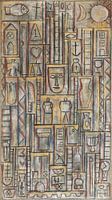 Modern kunstwerk met o.a. een man, vrouw masker, geloof en hoop, zon en maan, vis, liefde, weegschaal, torens, glas, vaas, kandelaar, klok, wijnfles etc