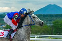 PYATIGORSK,RUSSIË - 12 MEI 2019:jockey Abdulmuslim Hasanov, de winnaar van de race om de prijs van de Noord-Kaukasus op hippodroom Pyatigorsk.