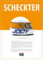 Afdrukken met de persoonlijke valhelmen van beroemde autocoureurs uit de jaren 1970.