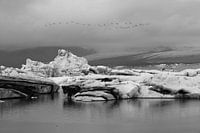 Jökulsárlón Glacier Lagoon met overvliegende zwanen in zwart-wit