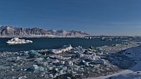 Uitzicht over het zuidelijke deel van de beroemde gletsjerlagune Jökulsárlón aan de zuidkust van IJsland met ijsbergen in het water en de besneeuwde uitlopers van de Vatnajökull op een zonnige winterdag.