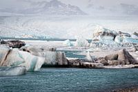 Enorme ijsschotsen in het Jökulsárlón gletsjermeer in IJsland, met op de achtergrond de gletsjer die langzaam uitmondt in het meer.