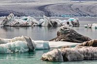 In het meer drijven witte, lichtblauwe en door vulkanisch stof grijs en zwart gekleurde ijsbergen rond. Ze hebben de…