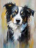 Een zacht, expressief hondenportret vangt zijn serieuze blik en zachte vacht met een reeks dynamische penseelstreken. De achtergrond heeft abstracte gele en blauwe tinten die de zwarte, witte en bruine vacht van de hond aanvullen.