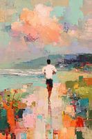 Een man loopt over het strand, gedragen door levendige energie, in een wit T-shirt en een zwarte korte broek. Het olieverfschilderij in impressionistische stijl betovert met krachtige penseelstreken, abstracte achtergronden en verzadigde kleuren. De lucht is gevuld met kleurrijke wolken, terwijl felroze tinten de scène domineren en vreugde uitstralen. De symmetrische compositie creëert tegelijkertijd evenwicht en dynamiek. De combinatie van beweging, kleur en textuur vangt de vitaliteit van het moment en geeft een zomers, optimistisch gevoel vol lichtheid en levensvreugde.