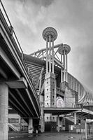 Deze fraaie zwart-wit foto is onderdeel van een serie en toont de beroemde Johan Cruijff Arena in Amsterdam, de thuishaven van de wereldberoemde voetbalclub AJAX.