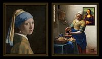 Vervat in 2 schilderijen die tegen een zwarte achtergrond hangen, is links het Meisje met de parel te bewonderen en rechts het Melkmeisje, waarop de achtergrond tegen de keukenwand de Mona Lisa te zien is.