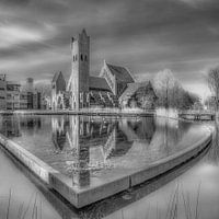 Johannes de Doperkerk in Leeuwarden in monochroom. Gespiegeld in de ernaast liggende vijver van het Van Hall instituut