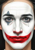 Een opvallend, geschilderd portret toont de Joker met een betraande uitdrukking.