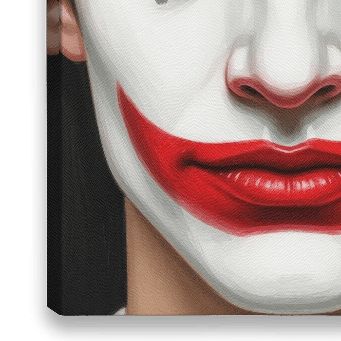 Een opvallend, geschilderd portret toont de Joker met een betraande uitdrukking.