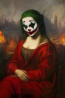 Het schilderij toont een fascinerende herinterpretatie van de iconische Mona Lisa, die is afgebeeld in een opvallende Joker-look. Haar gezicht wordt gekenmerkt door levendige, opzichtige make-up: de lippen zijn geschilderd in een diepe, scharlakenrode tint en vormen een brede, ondeugende glimlach die doet denken aan de beruchte Joker. De ogen zijn omrand met dramatisch zwart, waardoor ze er zowel mysterieus als uitdagend uitziet.