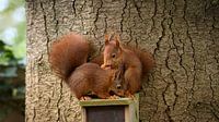 Beschrijving: Ontdek de schattigheid van de jonge rode eekhoorns terwijl ze genieten van een smakelijke maaltijd op ons charmante voederhuisje. Deze foto is genomen in het prachtige natuurgebied de Veluwezoom, waar de dennenbomen hun kenmerkende boomschors tentoonstellen.