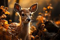 Jong hert ontdekt het bos in de vroege ochtend. Herfst kleuren. Nieuwsgierig.