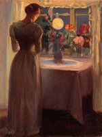 Jong meisje voor een verlichte lamp, Anna Ancher
