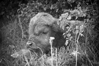 Jong klein schotse kalf tussen de struiken in de kleuren zwart-wit