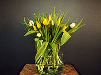 De achtergrond is zwart, wat de heldere kleuren van de tulpen benadrukt en een dramatisch contrast creëert. Het geheel heeft een moderne en klassieke uitstraling tegelijkertijd.