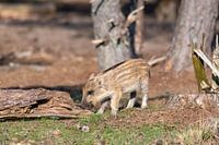 Onder de boomstronken zit vaak wel wat smakelijks. Dit jonge wild zwijntje snuffelt er op los in het Nationaal park de Hoge Veluwe.