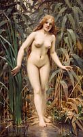 Deze jonge vrouw loopt door het riet naar het water om te gaan baden of zwemmen. De meid begeeft zich naakt door de natuur. Het model geeft haar benen, heupen, buik, torso en borsten bloot. Tevens zijn schouders en armen ontbloot van het naaktmodel.
