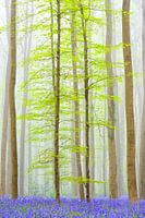 Jonge Beuken in het met Wilde Hyacinten bedekte Hallerbos in het voorjaar. Elk voorjaar bloeien Wilde Hyacinten of Boshyacint in het Hallerbos, wat veel toeristen aantrekt. De ochtend mist boven de paarse bodem met een fris groen bladerdek geeft een sprookjesachtige sfeer.